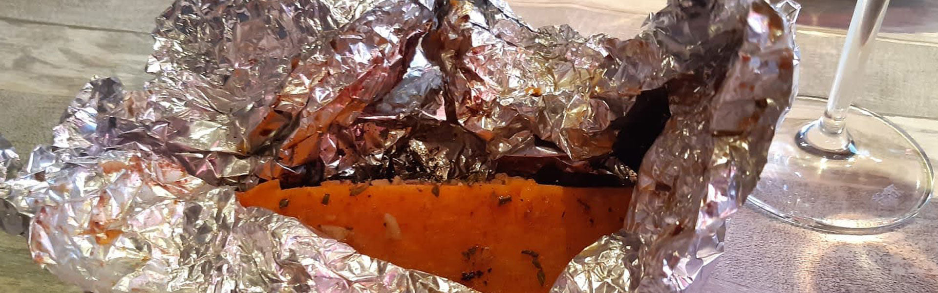 Gepofte zoete aardappelen van de barbecue met kruidige boter op basis van rozemarijn, bosui, knoflook, gember en kaneel. Een warme smaakcombinatie geïnspireerd op heel oude kookboeken. Een bijzonder, maar eenvoudig bijgerecht voor een zomerse grillavond.