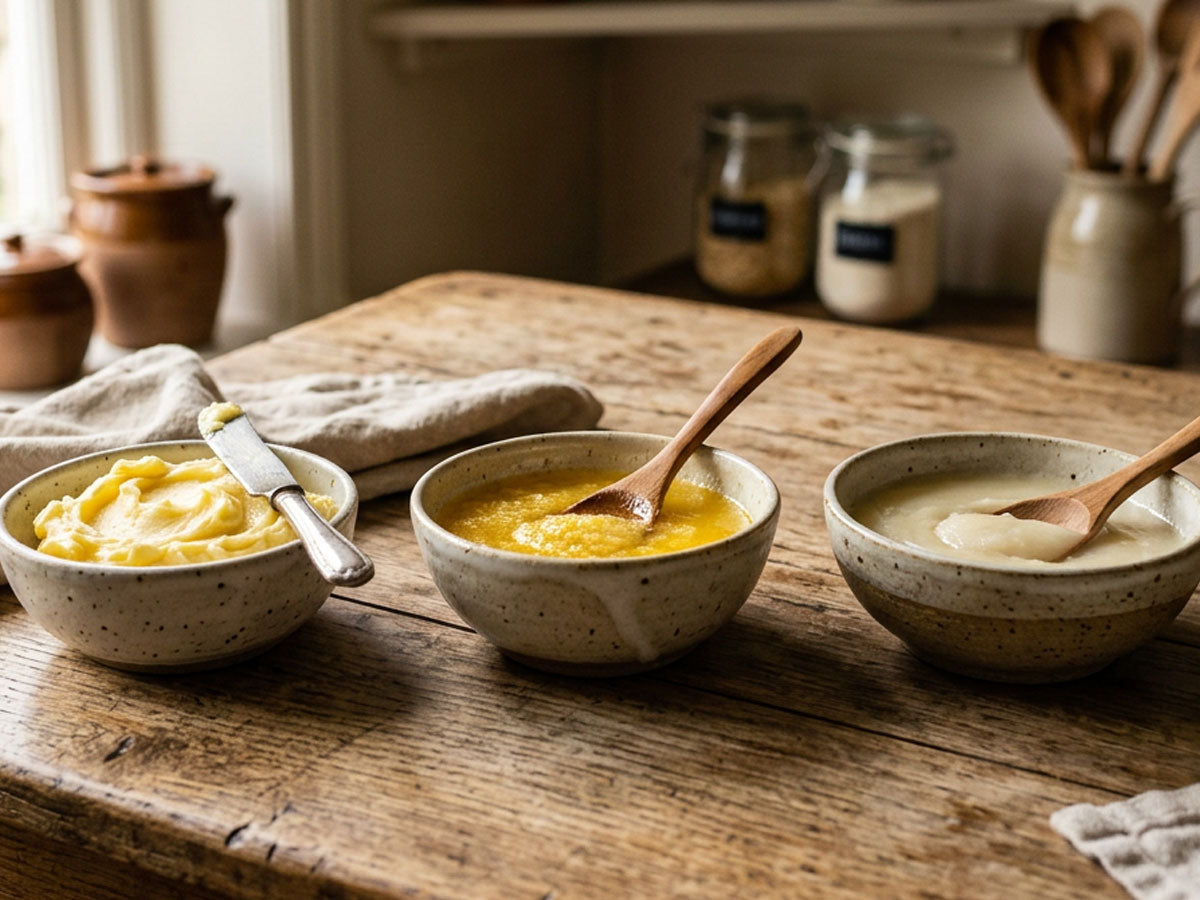 Las grasas animales como la mantequilla, el ghee, la manteca y la grasa de pato se utilizan desde hace siglos en las cocinas tradicionales. Aportan a los platos un sabor profundo y rico, y son especialmente adecuadas para freír, asar y preparar recetas clásicas.